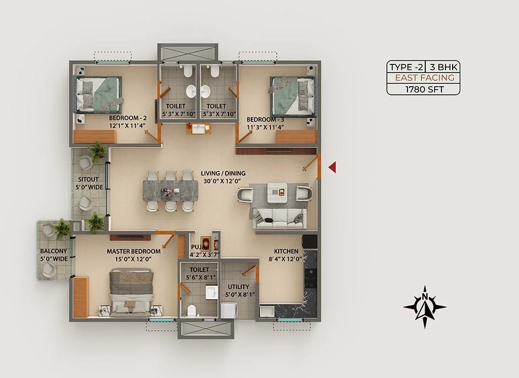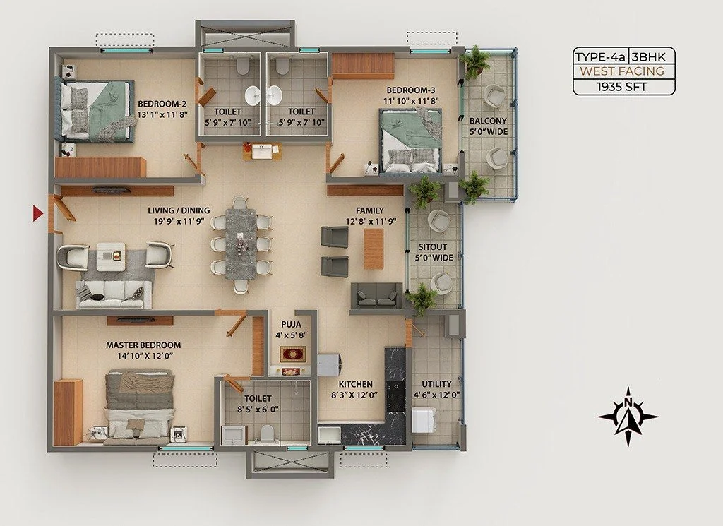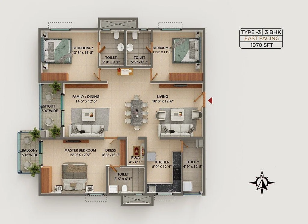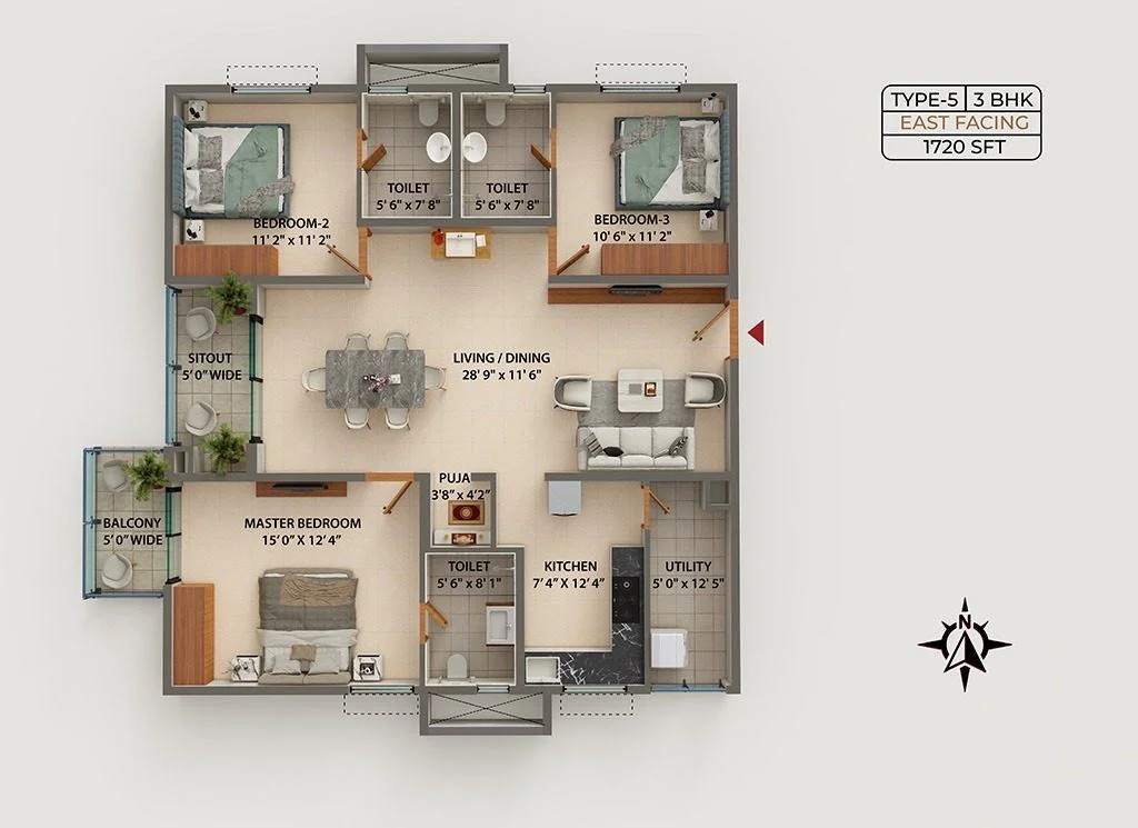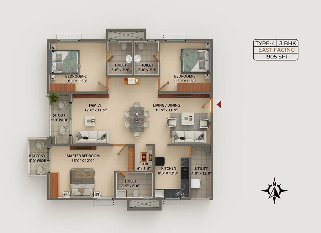 Power Outlets: Cooking range chimney, refrigerator, Water purifier, Microwave oven, mixer/grinders & Washing machine in Utility Area