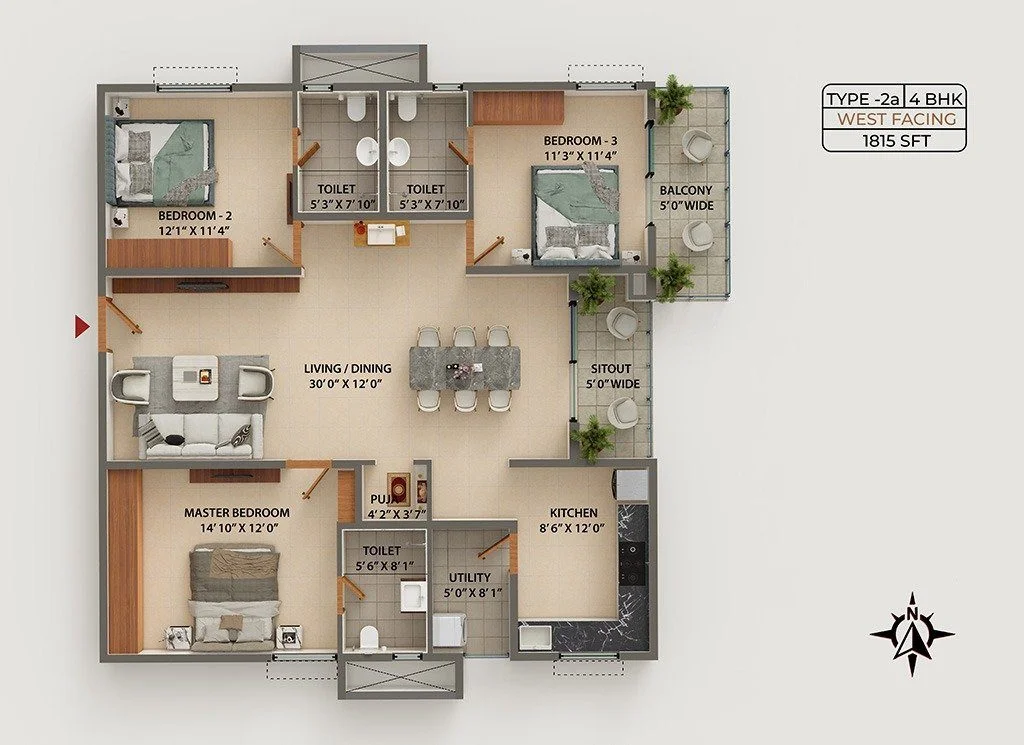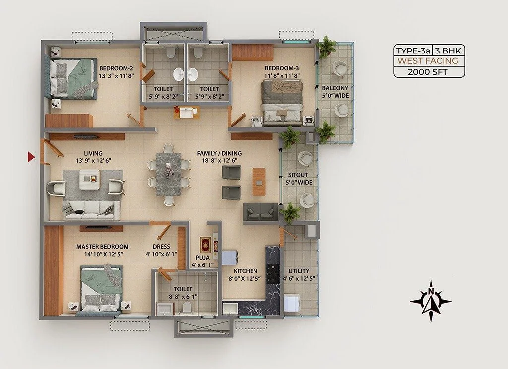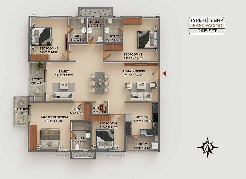 Power Outlets: Cooking range chimney, refrigerator, Water purifier, Microwave oven, mixer/grinders & Washing machine in Utility Area